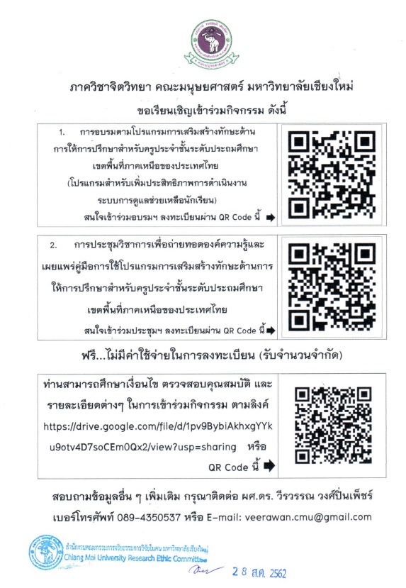 ภาควิชาจิตวิทยา คณะมนุษยศาสตร์ มหาวิทยาลัยเชียงใหม่ จึงขอความอนุเคราะห์จากท่านในการประชาสัมพันธ์และสนับสนุนให้ครูประจำชั้นระดับประถมศึกษา ในสังกัดของท่านเข้าร่วมกิจกรรมดังกล่าว ทั้งนี้ผู้ที่เข้ารับการอบรมตามโปรแกรมการเสริมสร้างทักษะด้านการให้การปรึกษาสำหรับครูประจำชั้นระดับประถมศึกษา เขตพื้นที่ภาคเหนือของประเทศไทยอย่างครบถ้วนจะได้รับวุฒิบัตรจากการอบรมครั้งนี้ ทั้งนี้ภาควิชาจิตวิทยา ได้ทำหนังสือขอความอนุเคราะห์ประชาสัมพันธ์และสนับสนุนให้บุคลากรในสังกัดเข้าร่วมกิจกรรมนี้ต่อผู้อำนวยการสำนักงานเขตพื้นที่การศึกษาประถมศึกษาแต่ละแห่ง ในเขตพื้นที่การศึกษาภาคเหนือของประเทศไทยอย่างเป็นทางการเรียบร้อยแล้ว สำหรับเงื่อนไขในการเข้าร่วมกิจกรรมตามรายละเอียดที่แนบมาพร้อมนี้
